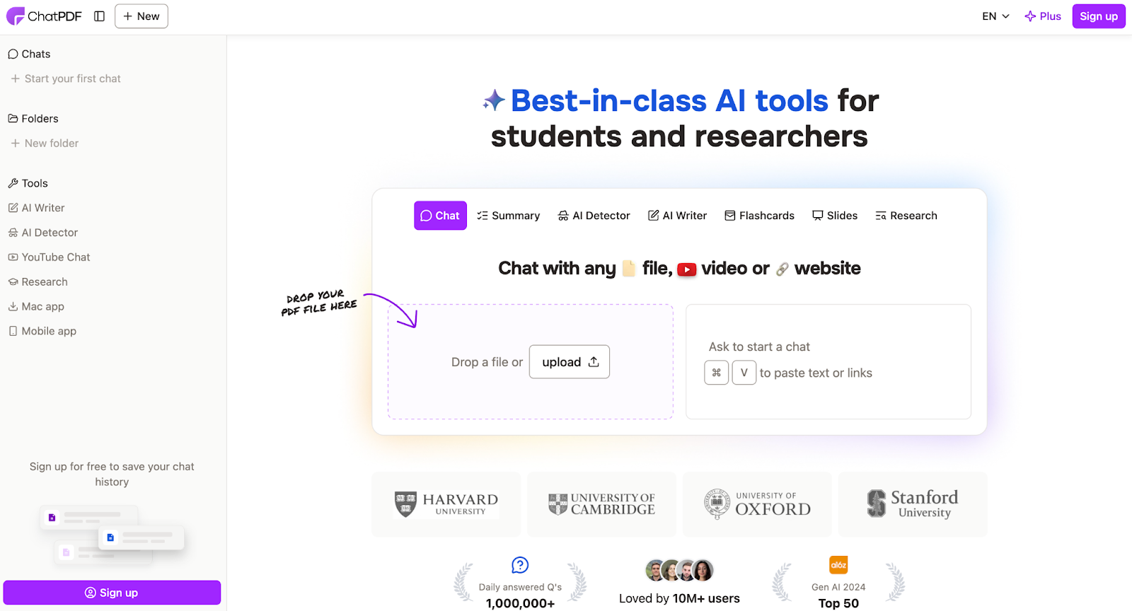 ChatPDF lets you upload your PDF files — like textbooks, readings, lecture notes, and research papers — and then ask questions about them in natural language. Instead of flipping through pages to find key info, you can interact with the content directly: get summaries, clarify confusing sections, and pull out the most important points. This makes it especially useful for research, writing, and understanding dense academic materials.