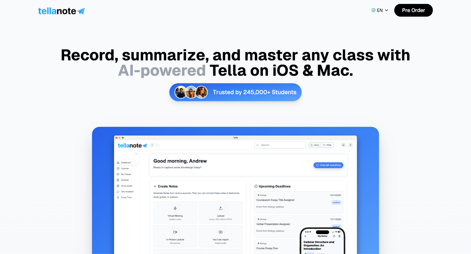 TellaNote is an AI-powered tool that helps students turn raw study content — like lecture notes, recordings, PDFs, and articles — into clear summaries, organized notes, and searchable insights. Instead of just storing text, it aims to help you understand and interact with your materials, making it easier to find key ideas and build understanding over time.
