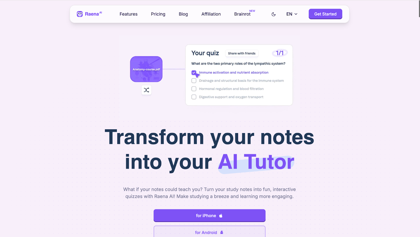 Raena AI is a study assistant built to make learning more interactive and engaging. It focuses on active recall by turning notes into quizzes and review materials.